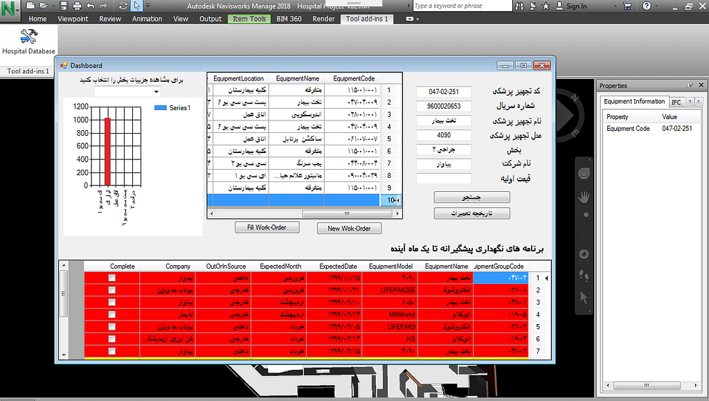 برای ارائه سیستم مدیریت تعمیر و نگهداری بیمارستان، در قدم اول پایگاه اطلاعاتی تجهیزات پزشکی تهیه گردید. این مجموعه شامل اطلاعات عمومی تجهیزات، برنامه های نگهداری پیشگیرانه و کالیبراسیون، درخواستهای تعمیرو فعالیتهای انجام شده، اطلاعات شرکتها، هزینههای تعمیرات و نگهداری و خرید تجهیزات جدید میباشد. در گام دوم برای بهبود سیستم، تسهیل ورود و خروج اطلاعات و آنالیز اطلاعات، این پایگاه اطلاعاتی در ارتباط با مدل ۳ بعدی بیمارستان قرار گرفت. به این ترتیب با انتخاب تجهیزات از روی مدل، امکان دستیابی به اطلاعات عمومی تجهیز پزشکی، تاریخچه تعمیر و نگهداری و هزینههای مربوطه، برنامههای نگهداری پیشبینی شده وجود دارد.